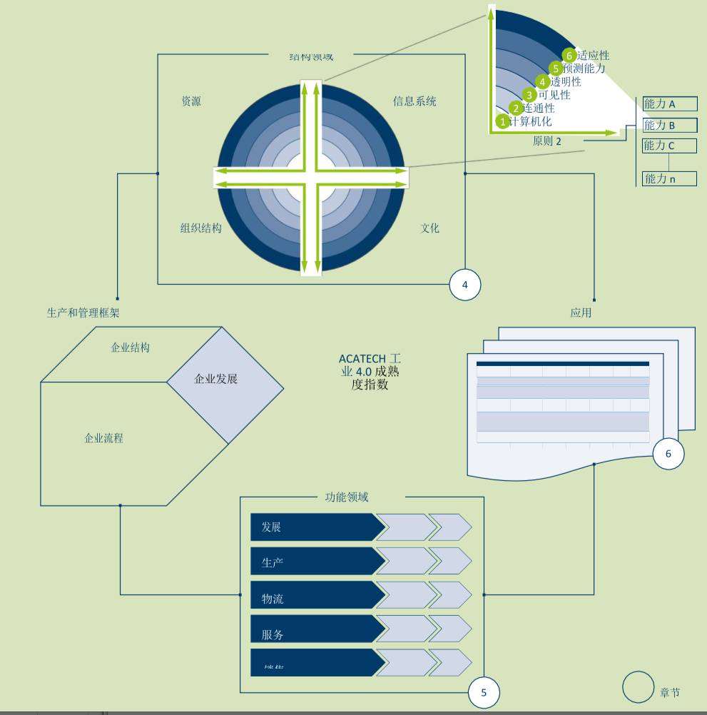 在上述模型的基础上,最后描述了《工业4.0指数》的应用。在使用过程中,结构领域、功能领域和成熟度等级被结合起来,以确定制造型企业的总体成熟度和各个功能领域的成熟度。