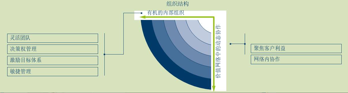 有机的内部组织和价值网络内的动态协作这两个原则贯穿结构领域“组织结构”,因此,“组织结构”是对组织从内部和外部两个角度的描述。