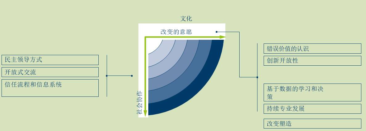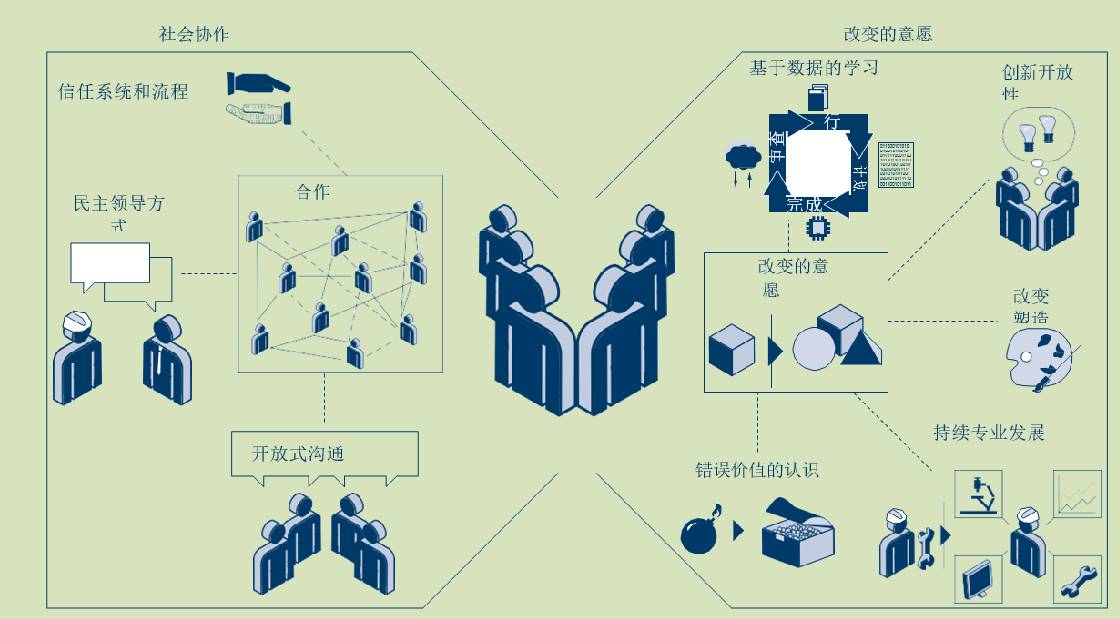 必要的企业文化转型包括两个关键问题。第一,员工在多大程度上愿意不断审视自我行为并使行为适应变化的环境?第二,员工在多大程度上认为其行动应该接受基于数据和事实认知的引导?显然,文化的第二原则——社会协作,有助于加快企业内部的认识分享。