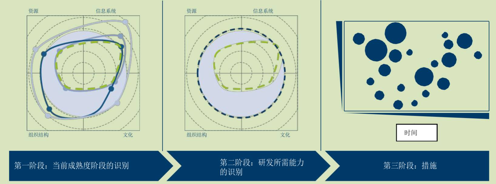 从四个结构领域缺失的能力可以得出必要措施,而对各个流程的评估可以对这些措施进行精确定位。之后,企业开始制定路线图并尽快执行措施。这些措施采用上述两步法进行制定,第一步是实现成熟度阶段的一致性,第二步是引入达到更高成熟度等级的措施。