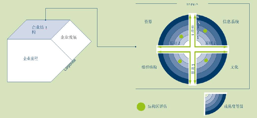 可以通过各个流程的得分汇总得出各个功能区以及企业整体的总分。这些分数的视觉说明可以快速确定平均成熟度等级并标记四个功能区发展阶段的不同。理解不同结构区对比方式的主要目的是确保他们以相同速度发展。如下示例,如果“资源”和“文化”结构区的得分远远高于其他两个结构区,就意味着“信息系统”和“组织结构”结构区缺乏相关能力,所以相应的能力也不能加以利用。