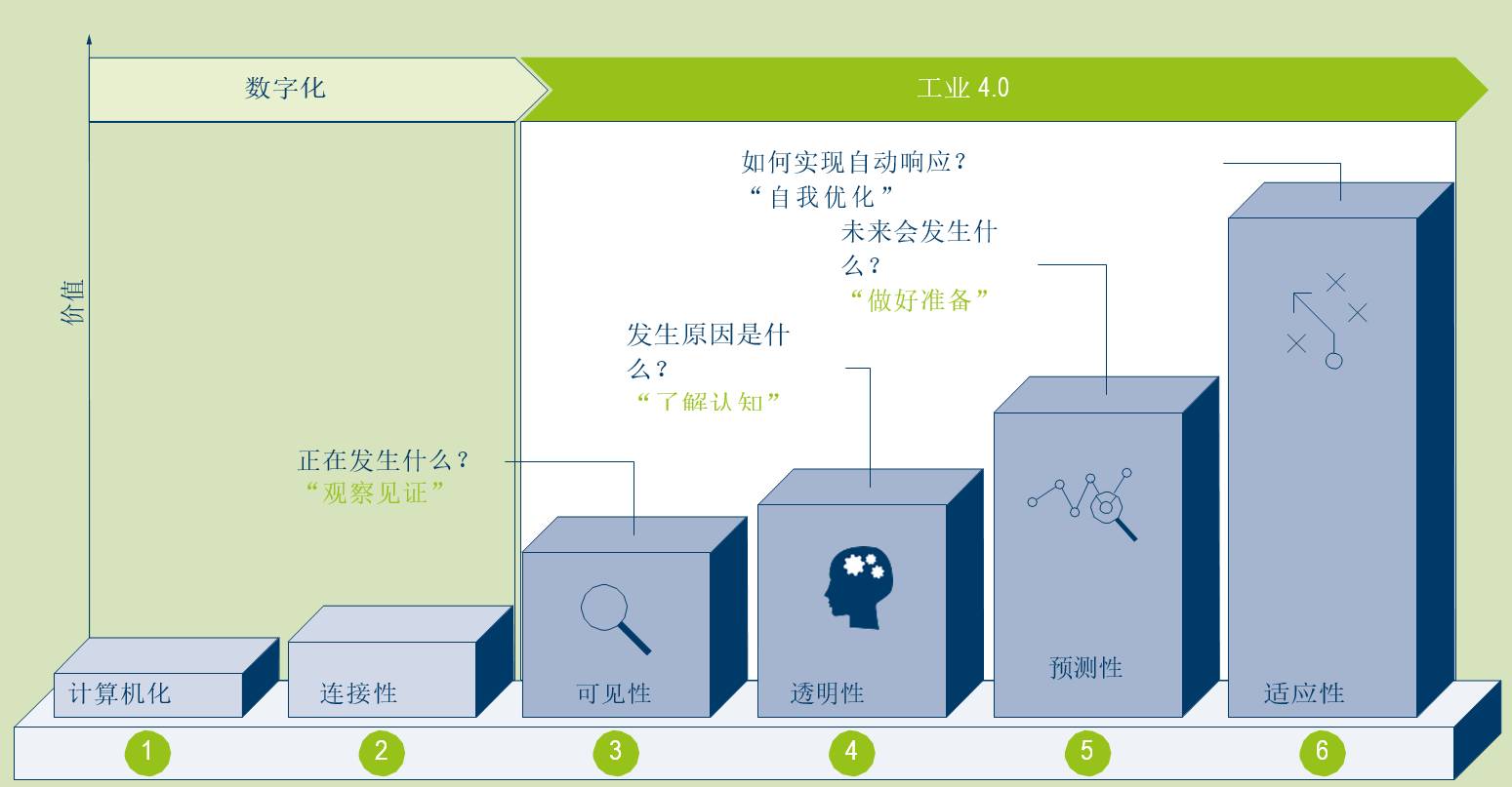 该路径包括六步法,也可以看成是工业4.0的六个阶段,可分为计算机化、连通性、可见性、透明性、预测性、适应性。每一步都建立在前一阶段之上,并且说明了达到每一阶段所需要的能力和实现的企业效益。