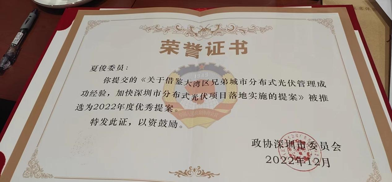 2023年1月5日下午,政协第七届深圳市委员会常务委员会第九次会议在市政协前一楼常委会议室召开,深圳市政协主席、党组书记林洁、市纪委副书记、市监委副主任任宗理、市中级人民法院院长张应杰、市人民检察院检察长李小东等有关领导出席会议。会上深圳市政协常委、深圳市电子学会常务副理事长兼秘书长夏俊同志荣获2022年度“优秀履职奖”;提交的《关于借鉴大湾区兄弟城市分布式光伏管理成功经验,加快深圳市分布式光伏项目落地实施的提案》被推选为2022年度优秀提案。